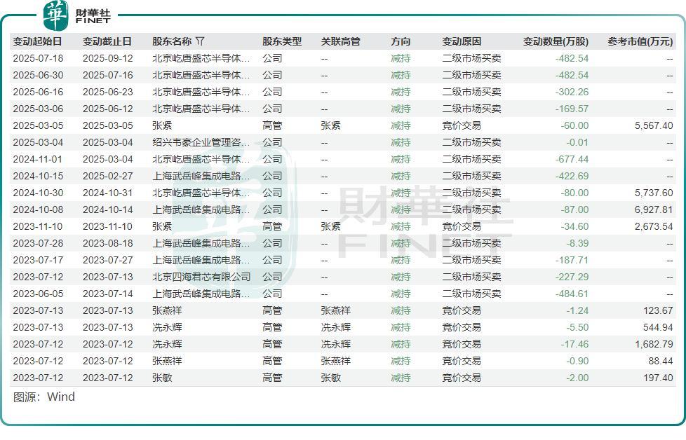Wind数据显示,自2022年10月以来,重要股东交易记录中未见任何增持,反而出现多笔减持,涉及绍兴伟豪、北京屹唐盛芯、上海武岳峰等机构,以及张紧、冼永辉、张燕祥等公司高管。