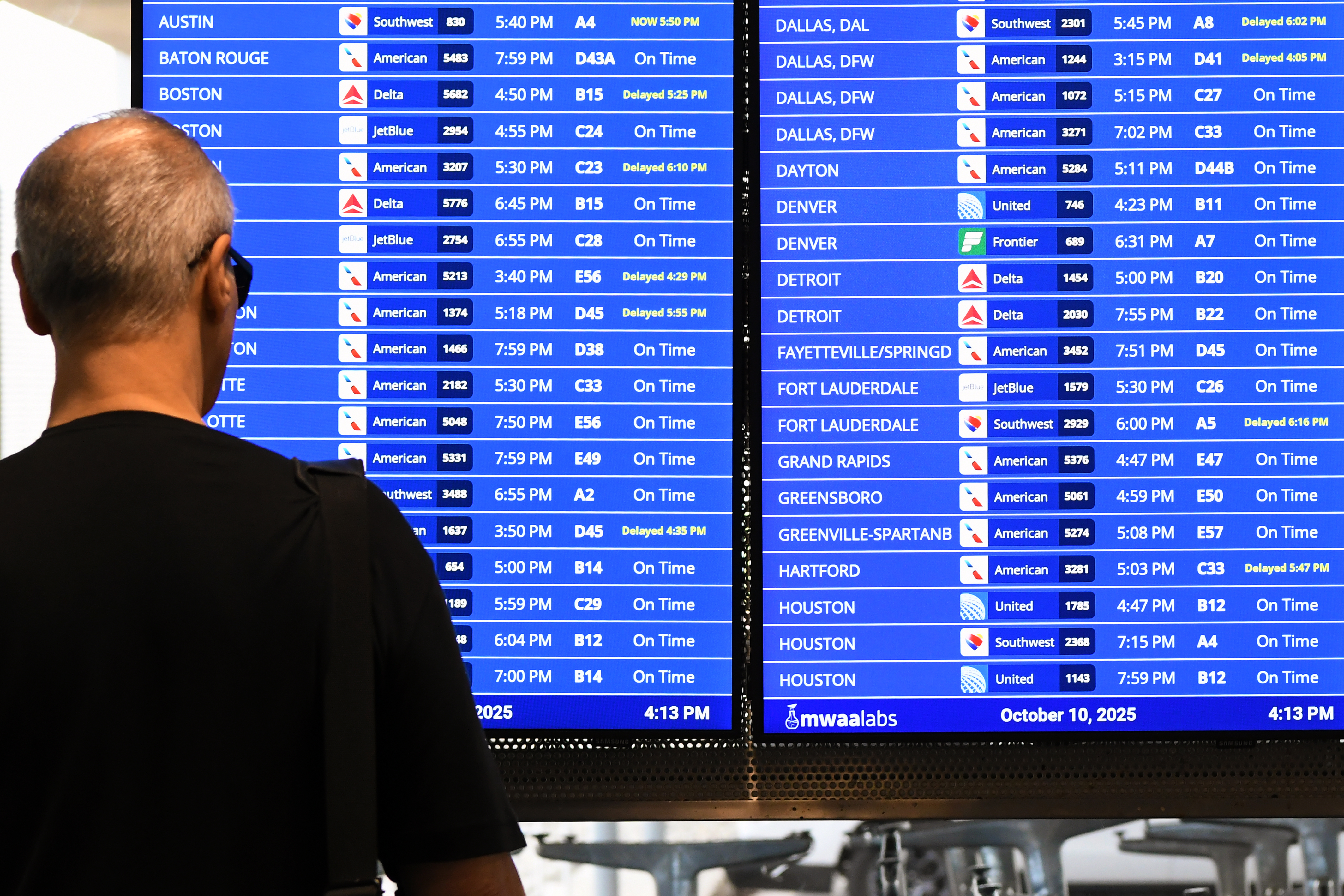 10月10日,在美国弗吉尼亚州阿灵顿的里根国家机场,一名男子查看航班信息。新华社记者李睿摄